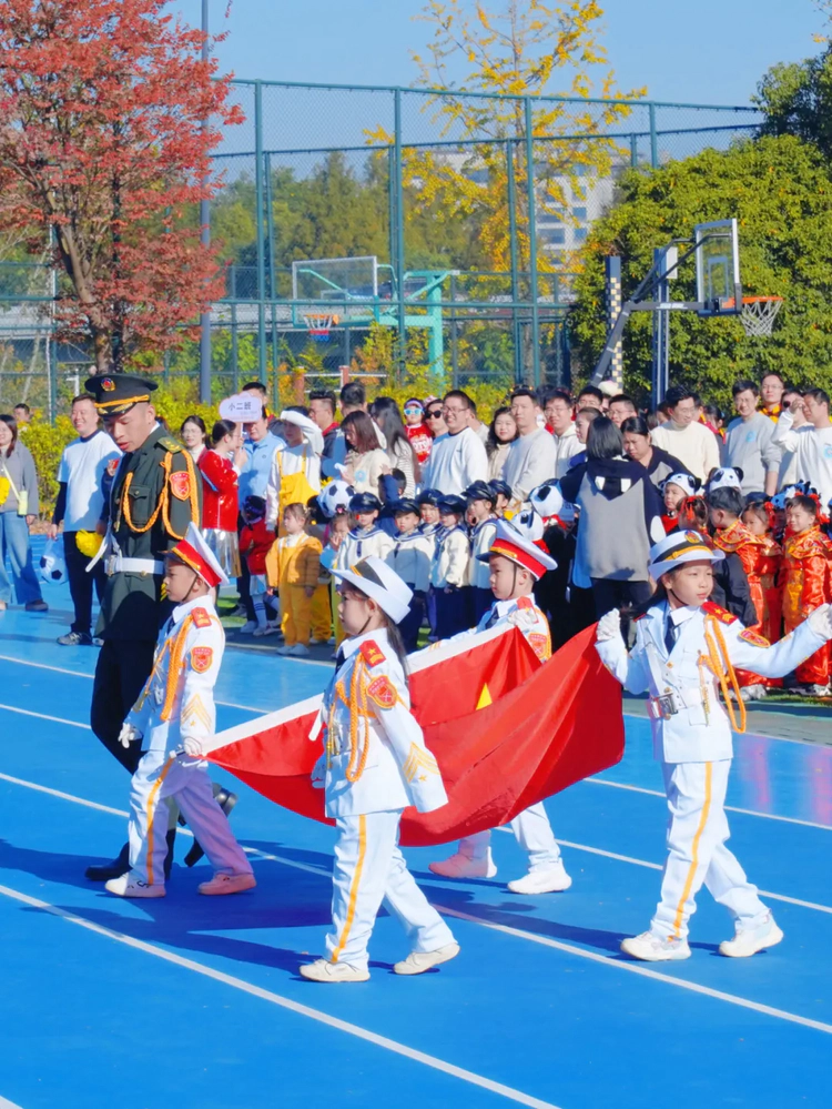 各班入场完毕,身着整齐服装的小小升旗手昂首挺胸,迈着刚劲步伐护送国旗走向旗杆。雄壮的国歌奏响,五星红旗缓缓升空,每一张稚嫩的脸庞满是庄重,眼神中显示出对祖国的热爱。