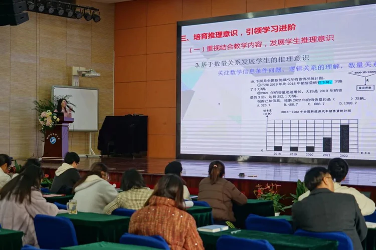 数学教研组黄雅秋老师以试卷分析为切入点,围绕试卷结构、素养考查占比等维度,深入探讨核心素养导向下的教学策略。结合学生答题情况,黄老师提出扎实可行的教学建议:一是紧扣教学内容,引导学生深度理解知识本质、强化知识应用,重视思维过程的交流与评价;二是以“表达”为路径,通过说题训练培养学生的逻辑推理意识;三是以“表征”为基础,鼓励学生用图表、文字、符号等多样方式呈现推理过程,让思维可视化;四是强化学科融合,将知识应用过程显性化,提升学生综合解题能力。